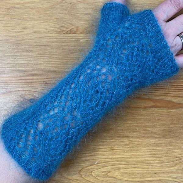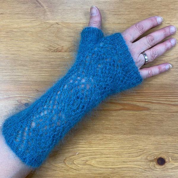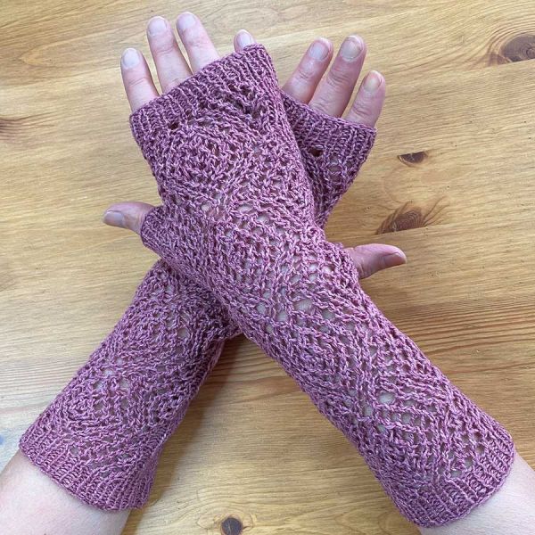 Die Armstulpe *Yina* hat ein filigranes, elegantes Lacemuster aus medaillonartigen Ornamenten auf der Rückseite des Unterarms und Handrückens. Die Anleitung enthält Angaben für einen Daumenkeil und Daumen, diese können jedoch auch weggelassen werden. Das Muster ist inspiriert vom japanischen Stil des Lacestrickens. Strickanleitung. Strickmuster mit Strickschrift.