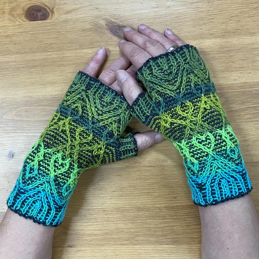 Anleitung für eine mehrfarbige Armstulpe mit Daumenkeil - ein bunter, fröhlicher Pulswärmer. Die Armstulpe wird im Stil von Matrix gestrickt - eine einfach zu strickende Hebemaschen-Zopf-Technik. Das Strickmuster ist einfacher als es aussieht. Anleitung mit Strickschrift.
