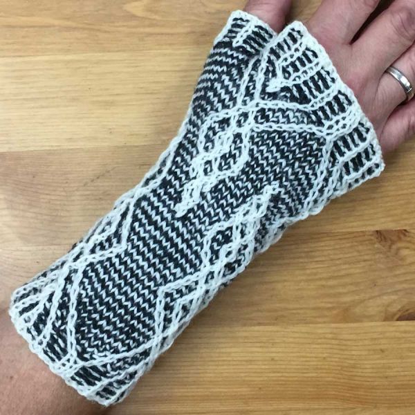 Die Armstulpe *Xamina* hat ein florales Muster im Stil von Matrix. Der Matrix-Stil sieht kompliziert aus - ist aber einfach zu stricken. Das Strickmuster ist einfacher als es aussieht. Anleitung mit Strickschrift.