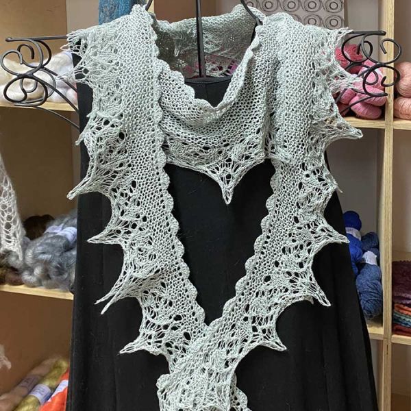 Das Tuch *Decora* ist ein schmales Schaltuch mit einer und schönen Strickspitze, das sich dekorativ tragen lässt Das Tuch wird von der Mitte aus gestrickt. Gestrickt von Birgit Freyer.