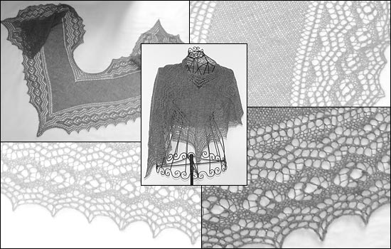 Gestricktes Schaltuch mit Strickspitze *LadyJane*. Durch die Winkelform sitzt das Tuch besonders gut auf den Schultern. Strickanleitung. Strickmuster mit Strickschrift.