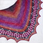 *Marella* is a small shawl with a curved neckline. It is knitted from the middle of the neckline downward in stockinette stitch and ends with a geometrical edging. The size is variable – detailed instructions are included in the pattern. *Marella* is suitable for beginners in lace knitting. The pattern is charted.