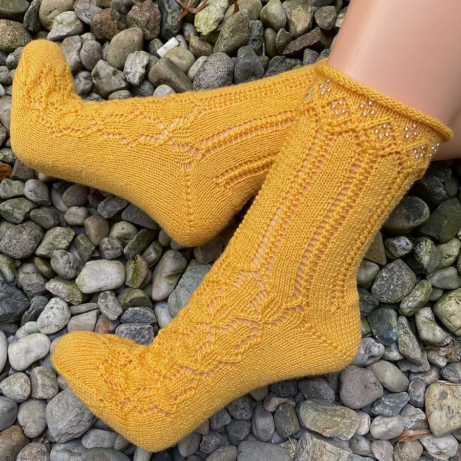 Die Socke *Goldy* hat ein streifenbildendes Lochmuster und einen Rand mit Perlen. Der Schaft kann beliebig lang gestrickt werden. Das Muster ist einfach zu stricken. In der Anleitung werden Ferse und Spitze nicht näher erläutert; diese werden in gewohnter Arbeitsweise gestrickt.  Anleitung mit Strickschrift.