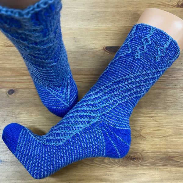 In der Anleitung werden Ferse und Spitze nicht näher erläutert; diese werden in gewohnter Arbeitsweise gestrickt. Die Socke wird ToeUp – von der Spitze zum Schaft – gestrickt. Der Workshop „ToeUp“ befindet sich auf der letzten Seite. Anleitung mit Strickschrift.