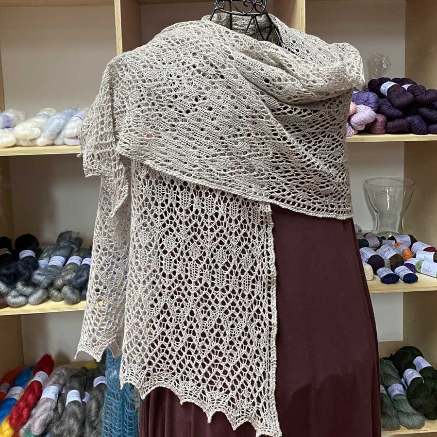 Die Stola *Romy* hat ein kleinteiliges Grundmuster, das sich mit dekorativen Musterstreifen abwechselt. Diese enden in einer eleganten Spitze. Sie wird von der Mitte ausgehend in beide Richtungen gestrickt, beginnend mit einem provisorischen Anschlag. Strickanleitung. Strickmuster mit Strickschrift.