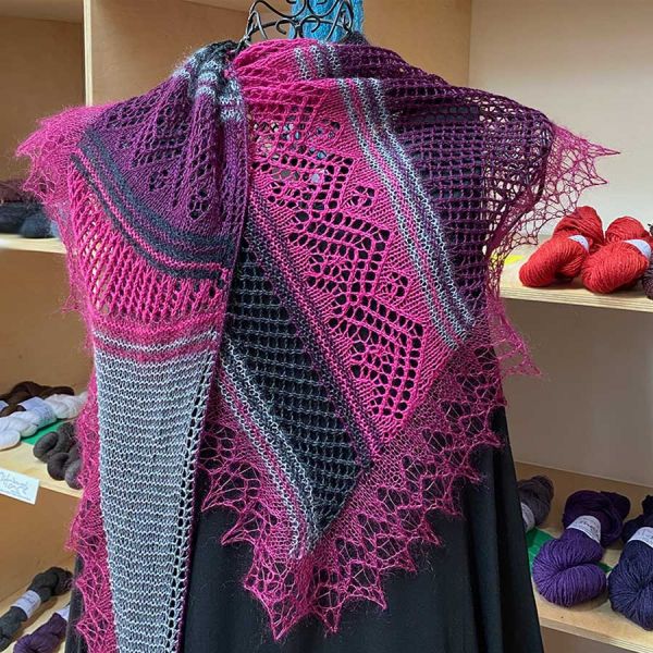 Das Tuch *LazyRocco* wird in asymmetrischer Schalform gestrickt und wirkt durch die verschiedenen Muster und Farben. Er kann aus 3 bis 4 verschiedenen Farben oder komplett einfarbig gestrickt werden. Strickanleitung. Strickmuster mit Strickschrift.