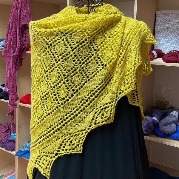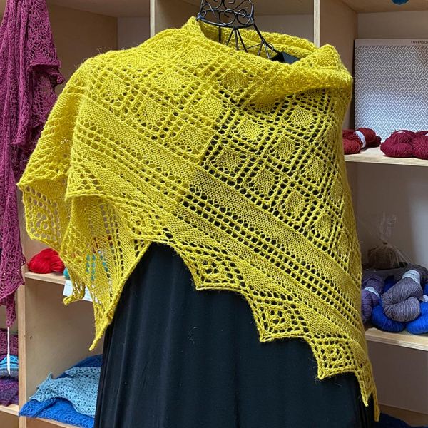 Gestricktes Schultertuch mit Strickspitze *Piastrella*. Strickanleitung mit Strickschrift. Das Tuch wird von der Spitze aus gestrickt.
