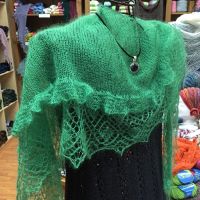 Das Tuch *Xandria* hat eine Bananenform. Besonders auffällig ist die Rüsche, die sich leicht über die Spitze legt. Die Strickspitze besteht auseinem einfachen Strickmuster. Das Tuch wird teilweise 2fädig (Hauptteil) und teilweise 1fädig (Spitze und Rüsche) gestrickt. Strickanleitung mit Strickschrift.