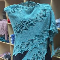 Das Tuch *Cassandra* hat eine Bananenform und einen interessanten Wechsel von glatt rechts und grafischer Musterstreifen mit einer Lacespitze. Strickanleitung mit Strickschrift.